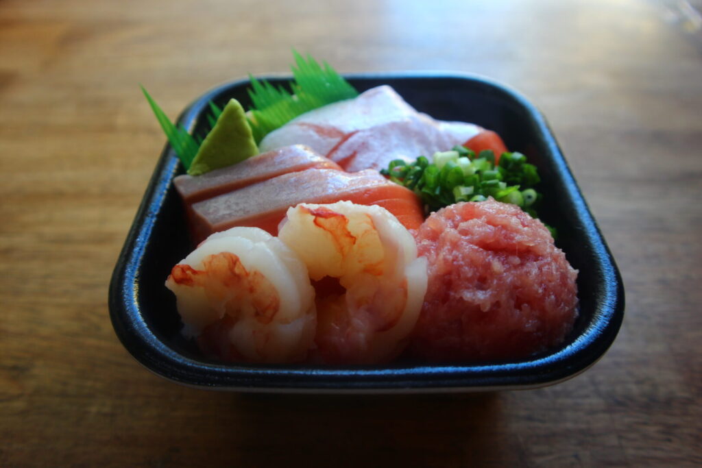 鮪切り落とし・サーモン切り落とし・生ホタテ・いか・大生海老・数の子・とろろ・大葉・刻み海苔